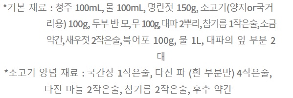4. 3번의 장국에 무를 넣고 끓이고, 무가 투명해지면 명란과 두부를 넣고 한소끔 끓이고 새우젓과 소금으로 간한 뒤 대파를 넣어 한소끔 더 끓이고 불을 끄고 참기름을 넣어 마무리한다.