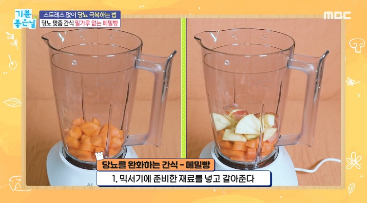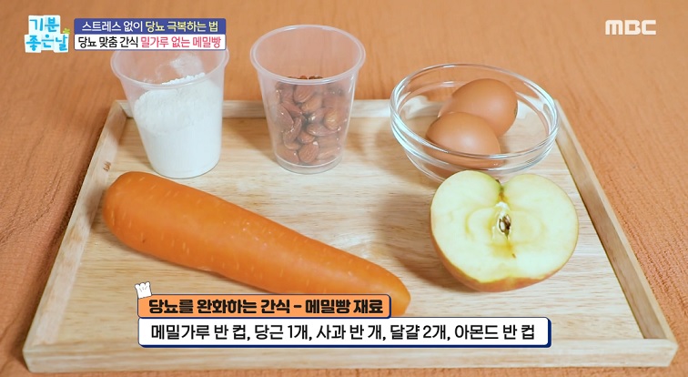 메밀가루 반 컵, 당근 1개, 사과반개, 달걀2개, 아몬드반컵