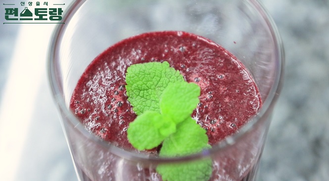4. 갈아준 주스는 컵에 담고 애플민트를 올려주면 끝