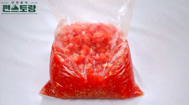 3. 2의 토마토를 지퍼백에 넣고 공기를 최대한 빼서 밀봉한다.