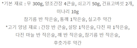 1. 무는 4cm 길이로 토막 내 0.7cm 굵기의 막대 모양으로 썰고 간장에 2시간 절인다.