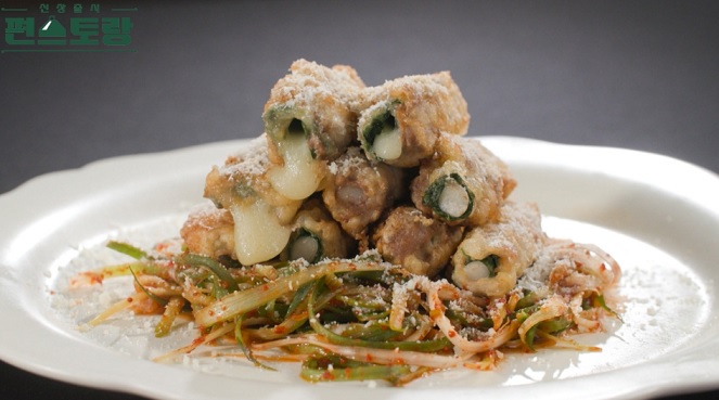 4. 치즈에 깻잎을 감싸고 차돌박이로 돌돌 만다.