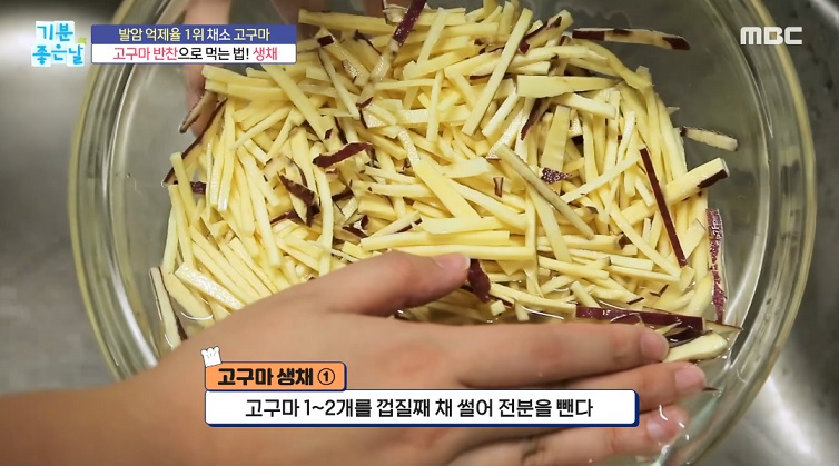 1. 고구마를 손가락 길이로 썰어 전분을 뺀다.