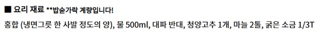 + 홍합이 물에 잠길락 말락 한 정도로 물을 넣으면 된다.