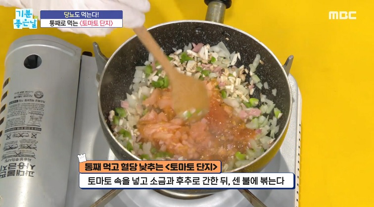 7. 토마토 속을 넣고 소금과 후추로 간한 뒤, 센 불에 볶는다.