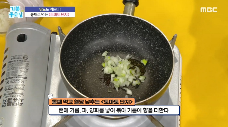 5. 팬에 기름, 파, 양파를 넣어 볶아 기름에 향을 더한다.