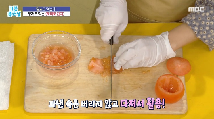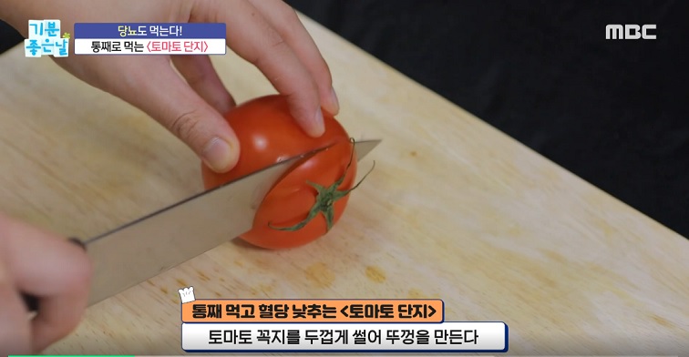 1. 토마토 꼭지를 두껍게 썰어 뚜껑을 만든다.