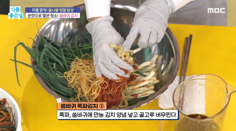 4. 쪽파, 씀바귀에 만능 김치 양념을 넣고 골고루 버무린다.