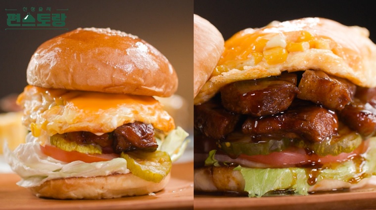 4. 3의 햄버거 위에 콜라갈비찜을 넉넉히 얹고 스크램블 콘치즈를 올린 뒤 빵을 올려주면 완성
