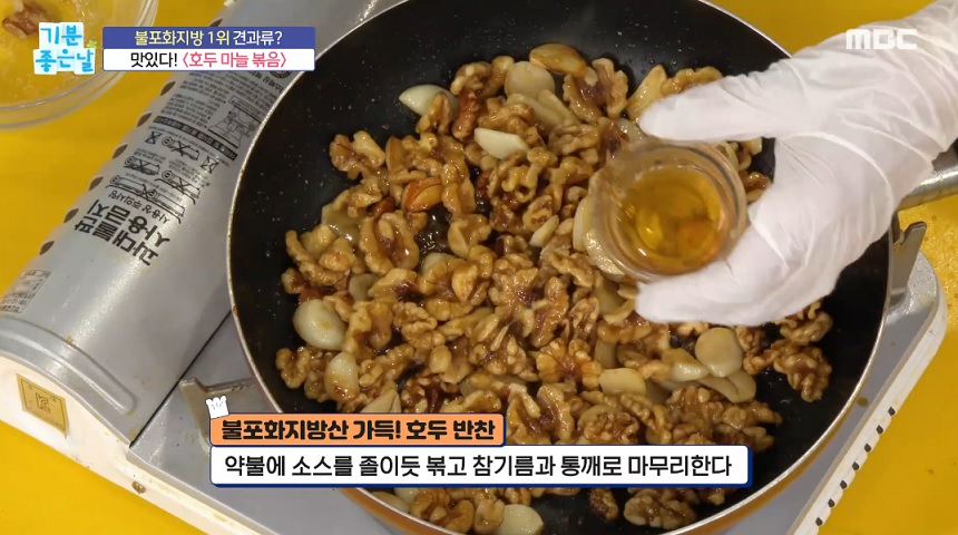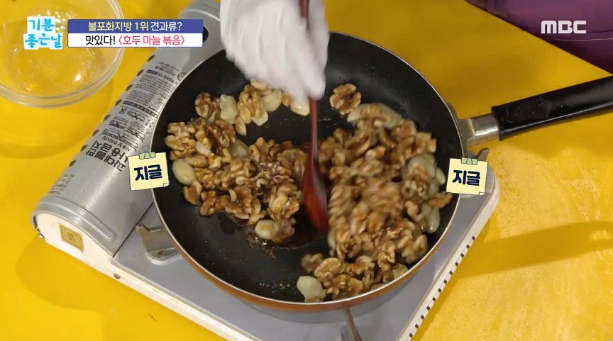 1. 마늘 향이 올라올 때 호두와 매실청을 넣어 함께 볶는다.