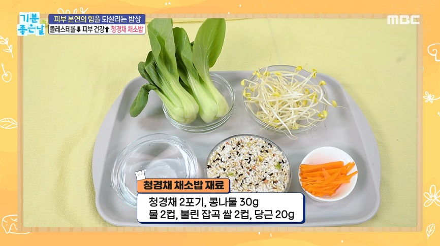청경채2포기, 콩나물 30g, 물2컵, 불린잡곡쌀 2컵, 당근 20g