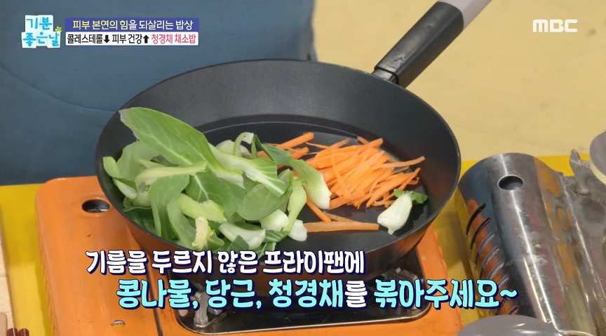 1. 기름을 두르지 않은 프라이팬에 콩나물, 당근, 청경채를 볶아주세요.
