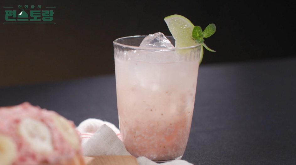 4. 컵에 발효딸기 250ml, 사이다 70ml를 붓고 잘 섞은 뒤 얼음을 넣어주면 완성