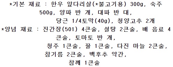 진간장(501) 4큰술, 설탕 2큰술, 배 음료 4큰술, 토마토 반개, 청주 1큰술, 꿀1큰술, 다진마늘 2큰술, 참기름 2큰술, 백후추 약간, 참깨 1큰술