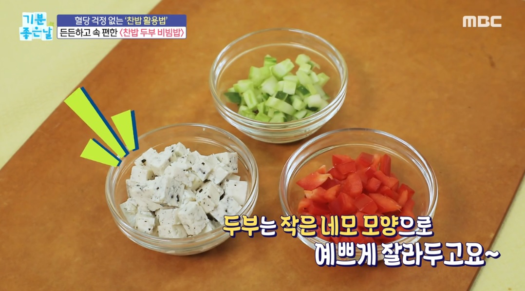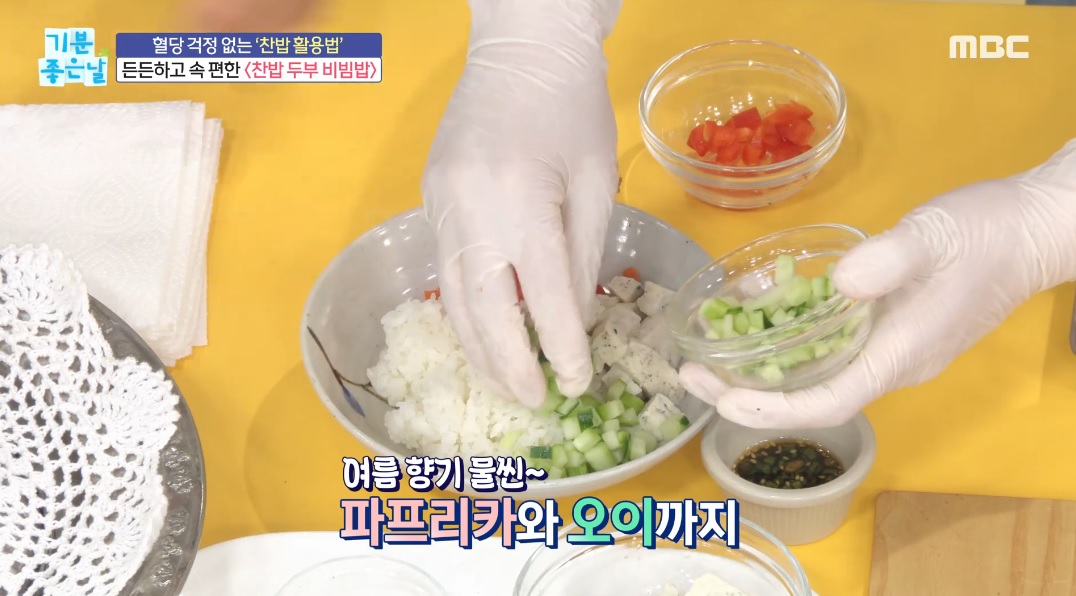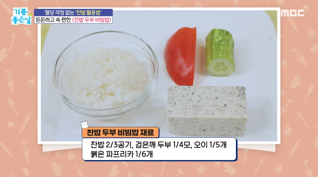 1. 찬밥 2/3공기, 검은깨 두부 1/4모, 오이 1/5개, 붉은 파프리카 1/6개