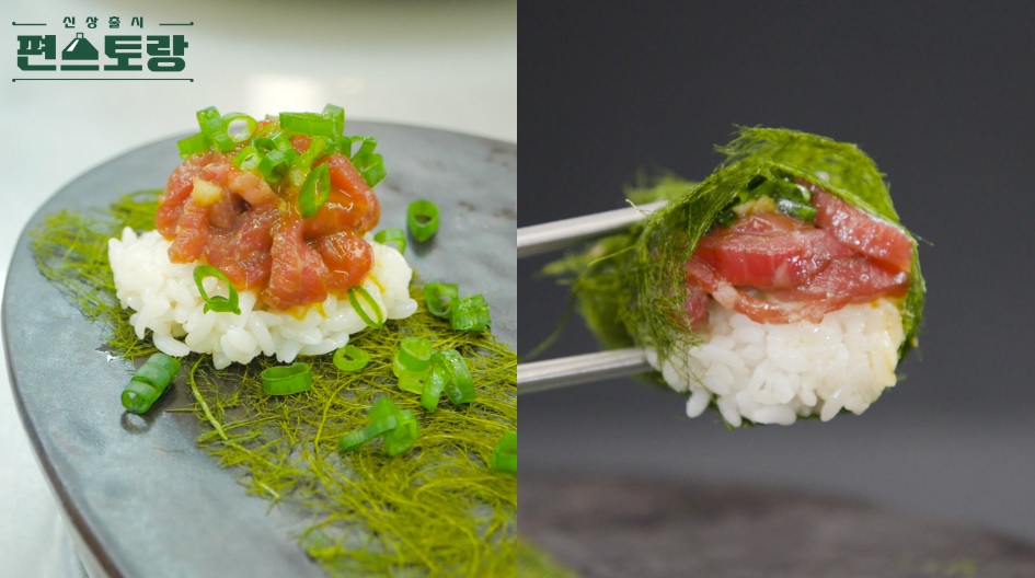 6. 접시에 감태를 깔고 뭉친 밥과 육회를 초밥처럼 올려준다.