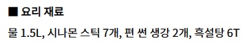 1. 물2리터에 시나몬스틱 7개, 편 썬 생강 2개를 넣고 강불에서 끓인다.